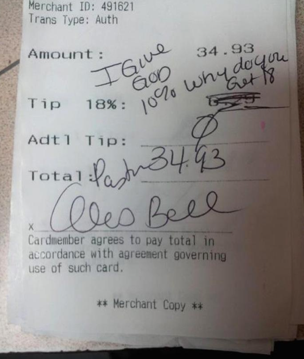 On January 25, a party of 10 dined at an Applebee’s in St. Louis. When Alois Bell picked up the check, she saw that the restaurant had added an 18% tip — a customary practice for large group. Bell crossed it out and wrote, “I give God 10% why do you get 18.” For good measure, she added the word “Pastor” before her name on the signature line.